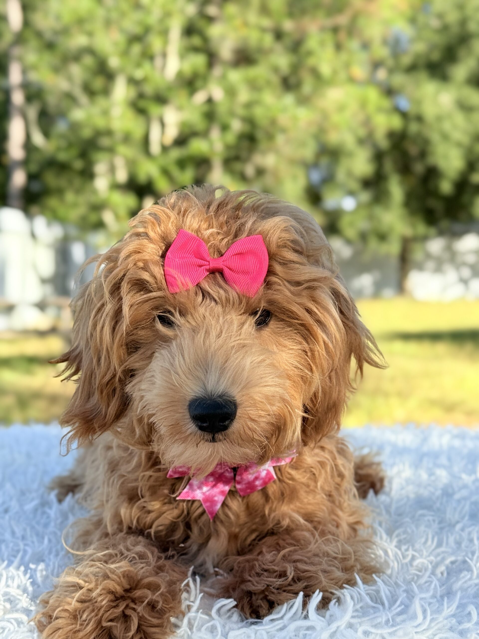 This beautiful F1b Small Medium Goldendoodle (female) has a charming personality, perfect for families looking for a loyal, gentle, and energetic companion.